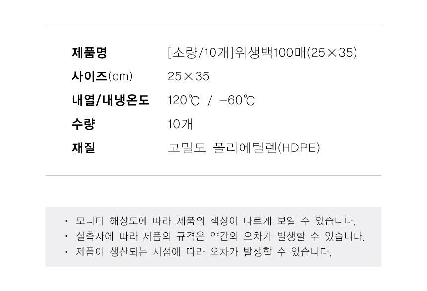[소량/10개]위생백100매(25×35) 16,300원 / 배송비 : 4,000원